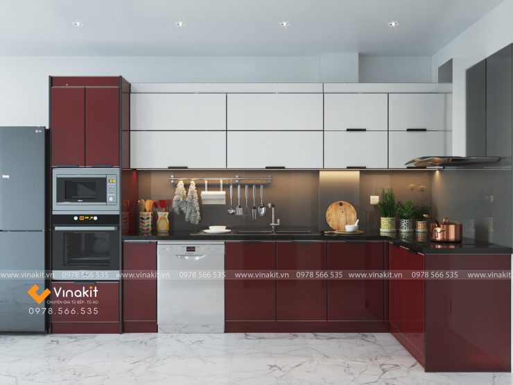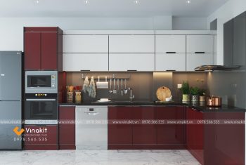 Kiểu dáng: Tủ trên chữ I, tủ dưới chữ L, kết hợp tủ kho